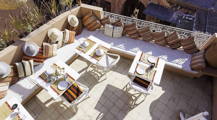 Located near the Ben Youssef Madrasa, Atay Café offers multiple levels of terraces with panoramic views of the Medina and Atlas Mountains. Its colorful décor and laid-back vibe make it perfect for groups, families, or solo travelers.